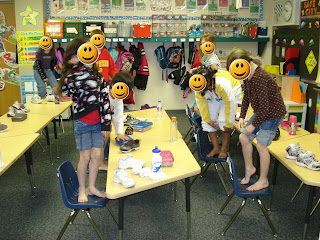 Since April is quite rainy here in Kansas, we have to be prepared for floods, you know. ;) So, we take off our shoes and socks, roll up our pants, and stand on our chairs, all lickety-split quick! I had the camera out b/c "our principal needed proof that we practiced the drill." I got some doozies of pictures! Enjoy!